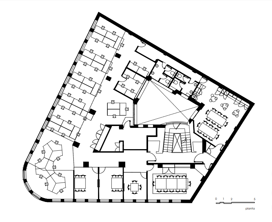 En esta planta, se buscaba la máxima flexibilidad de espacios por ello se reparten zonas de reunión para audiencias pequeñas y medias. Se dota de un esquema open office que permite el trabajo en equipo pero siempre permitiendo que cada usuario del espacio disponga de su espacio personal. Y por último, se agrupa el espacio office y el paquete de aseos para concentrar los ruidos en una zona que no influya en el buen desarrollo del trabajo. Las líneas de diseño que se trazan están siempre supervisadas por el CEO de Avature, que prima siempre la acústica y el contraste de un espacio neutro en acabados y transparente con abundancia de paredes de vidrio, con imágenes potentes que sirvan de inspiración para sus trabajadores.