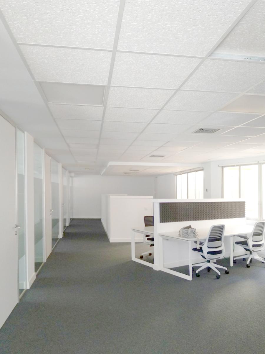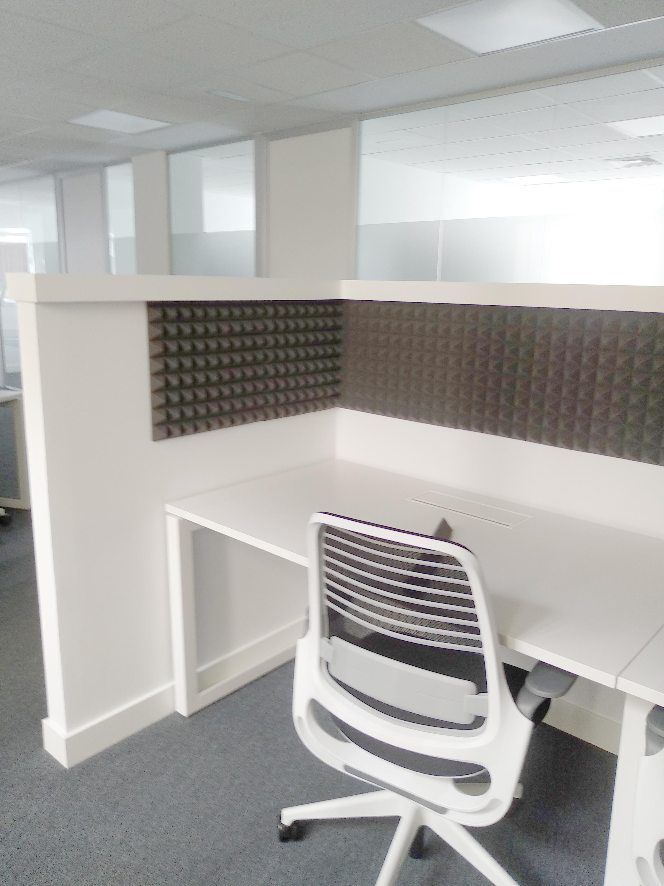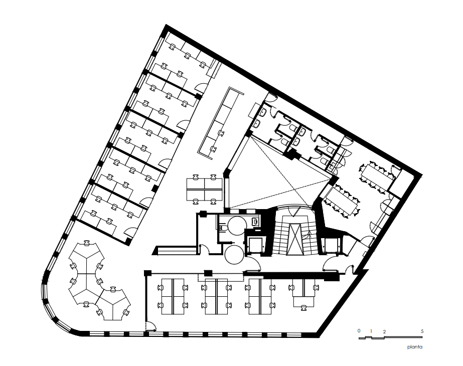 En esta planta, el brief se centraba en espacios “pecera” en el que hubiese un control acústico suficiente para poder desarrollar el trabajo en condiciones óptimas. De este modo se distribuye el espacio disponible en las distintas peceras pero permitiendo que la visión interior de la oficina siga siendo abierta por la presencia de paredes de vidrio que permiten que la vista viaje más allá del puesto personal de cada uno. Se agrupa el espacio office y el paquete de aseos para concentrar los ruidos en una zona que no influya en el buen desarrollo del trabajo. Los materiales y acabados elegidos siguen en concordancia con el resto de plantas pertenecientes a la compañía.