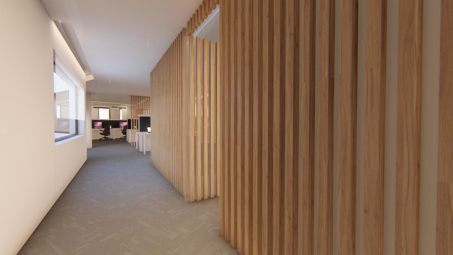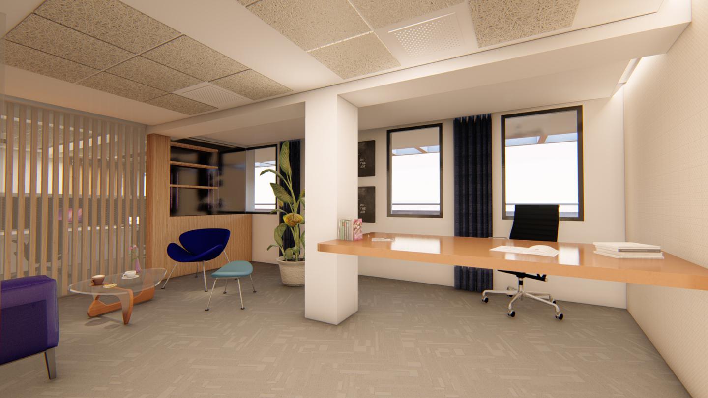 Se trata de la última planta del edificio, que cuenta con una terraza perimetral que recorre todo el frente a la calle y que no aparece en ninguna otra planta. Por ello, es el perfecto escenario para plantear la planta presidencial. En esta planta se encontrará el despacho del CEO y el resto de cargos importantes, dentro de la empresa. Por ello, aquí el esquema de open office se mantiene, al igual que la preocupación por la acústica y la privacidad de cada puesto dentro del conjunto. Sin embargo, se introduce un material nuevo: la madera. Que será el hilo conductor a través de toda la planta. La madera es un material noble que consigue aunar calidez y naturaleza. Al igual que un árbol se enraíza con fuerza en la tierra, esta planta situada en lo alto mira hacia el futuro y el crecimiento de la compañía, sin despegar nunca los pies del suelo.