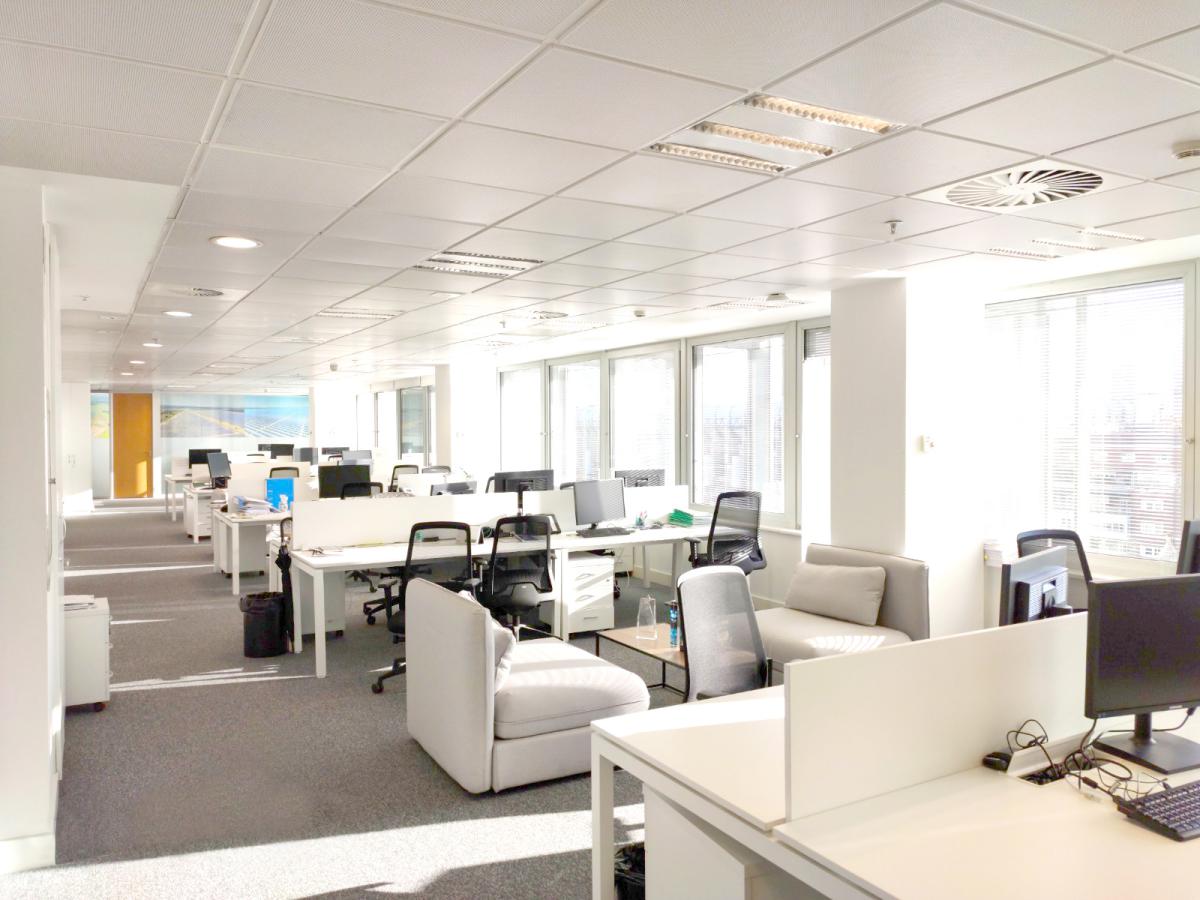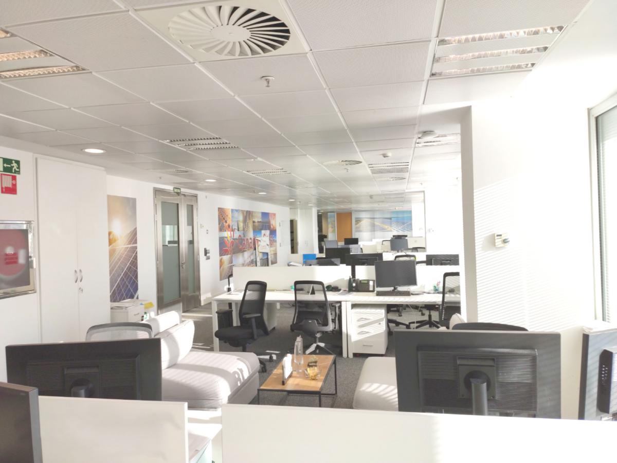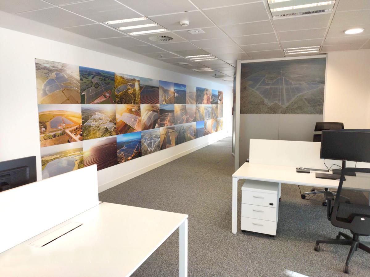 El local se transformó en un lugar de tonos neutros, dominado por la iluminación natural y donde se integran elementos singulares (imágenes) de todos los campos solares de los que dispone la empresa, generando un mosaico de colores atractivo y acercando la misión de la empresa a los trabajadores. El mobiliario e iluminación diseñados y fabricados a medida mejoran la funcionalidad de los espacios.