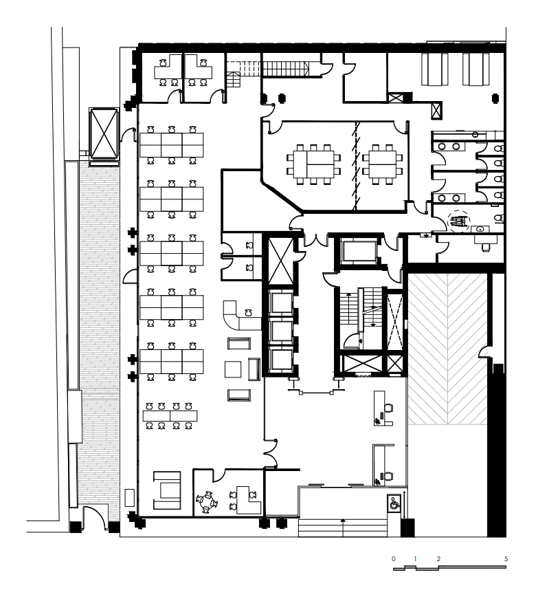 El local en bruto se transformó en un lugar de tonos cálidos, donde se integran elementos singulares como el techo a base de paneles acústicos y se utiliza madera de abedul para aportar calidez, que genera una combinación de colores atractiva, distintiva y cálida. El mobiliario e iluminación diseñados y fabricados a medida mejoran la funcionalidad de los espacios.