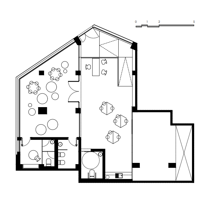 Constructivamente, se materializó en una estructura de hormigón vista, con revestimientos a base de tableros OSB y pinturas efecto estuco o pizarra, según las zonas, instalaciones vistas, aprovechando la gran altura del espacio, un cerramiento entre los dos grandes espacios principales, de carpintería de hierro, lacada al natural, con vidrios transparentes, para que todas las escenas interiores posibles estuvieran conectadas, y el color de la madera como melodía principal de los pavimentos.