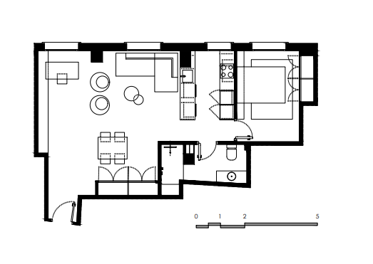 La ausencia de pasillos y distribuidores, así como la optimización del espacio mediante la redistribución total del piso, han dado como resultado un apartamento muy compacto, con espaciosas estancias.