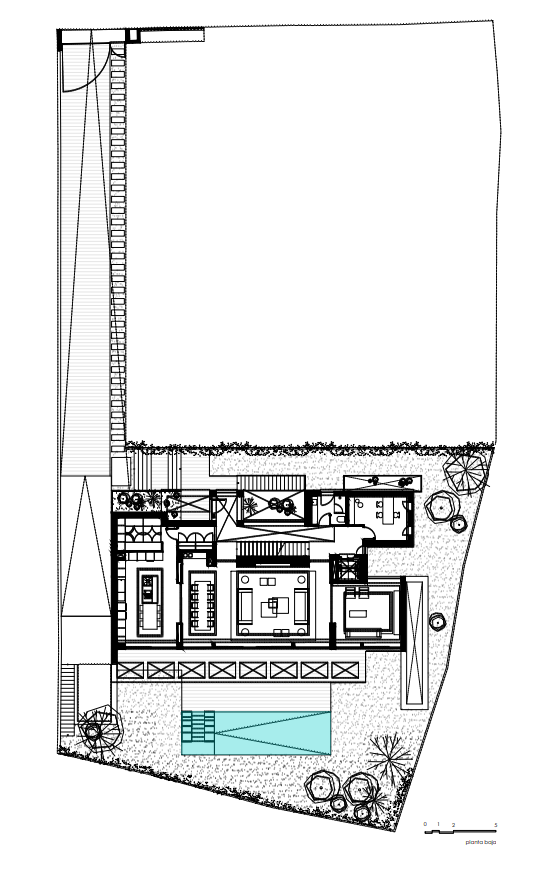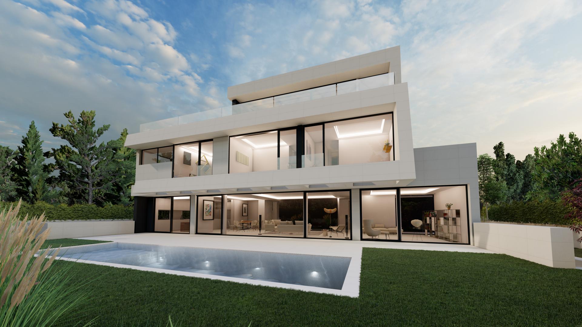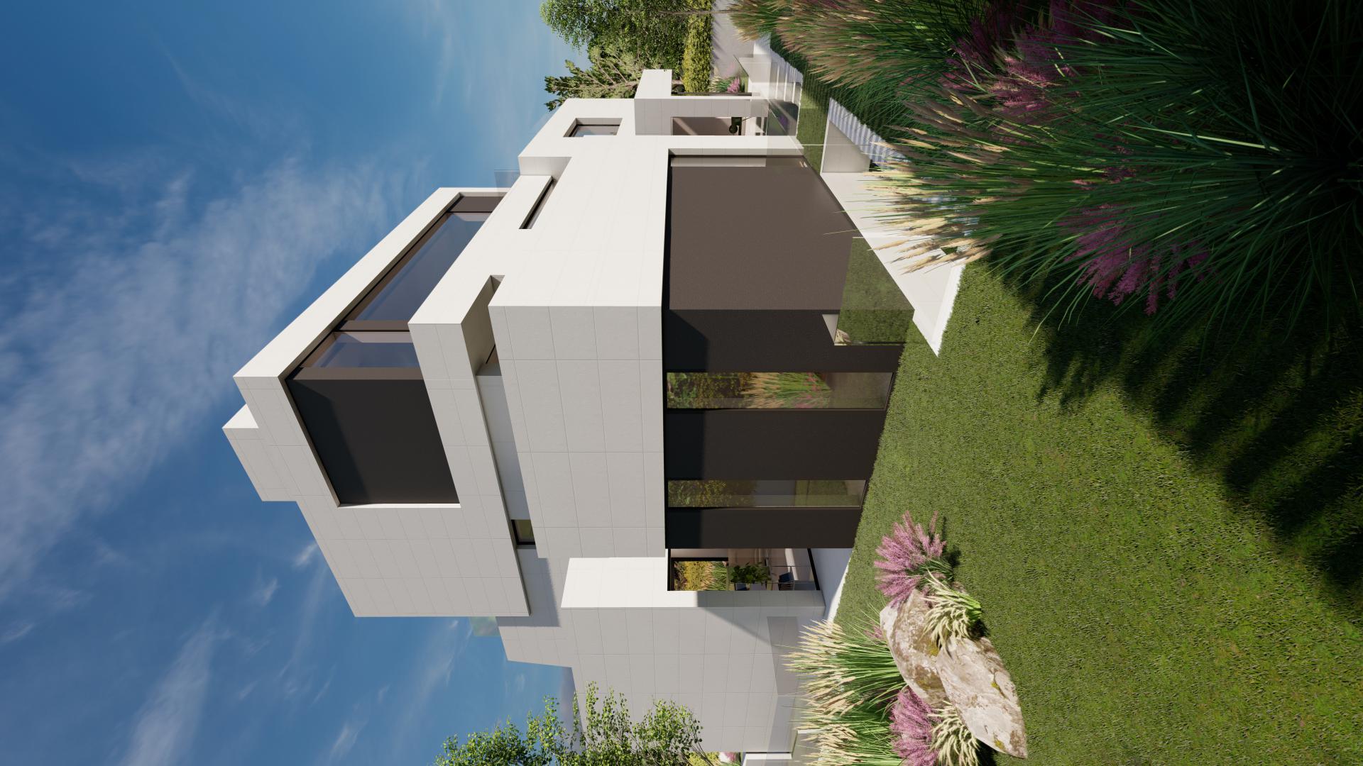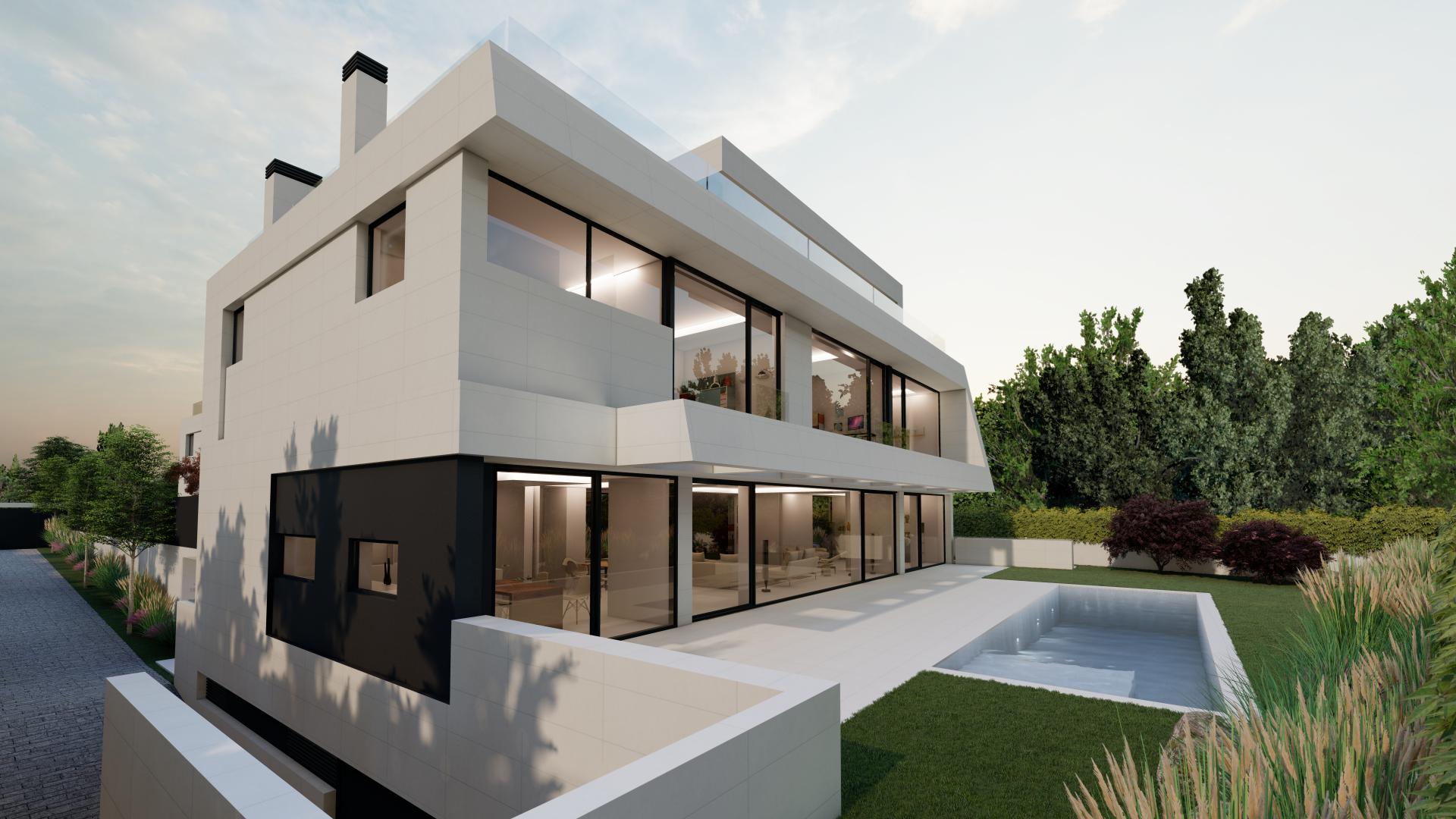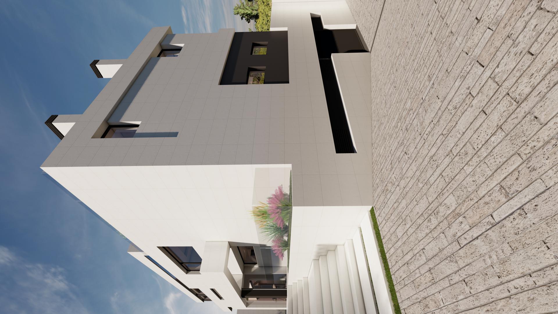 En esta vivienda, de líneas rectas, la superposición de planos y el juego de volúmenes, fueron los protagonistas del diseño. La masividad que presenta con las grandes fachadas de piedra caliza del cerramiento, se contrapone a los inmensos paños de vidrio de las fachadas principales y que permiten conectar de forma directa el interior de la vivienda, con el jardín y su entorno siendo esta parcela debido a su geometría la más complicada para ajustar el programa prouesto.
