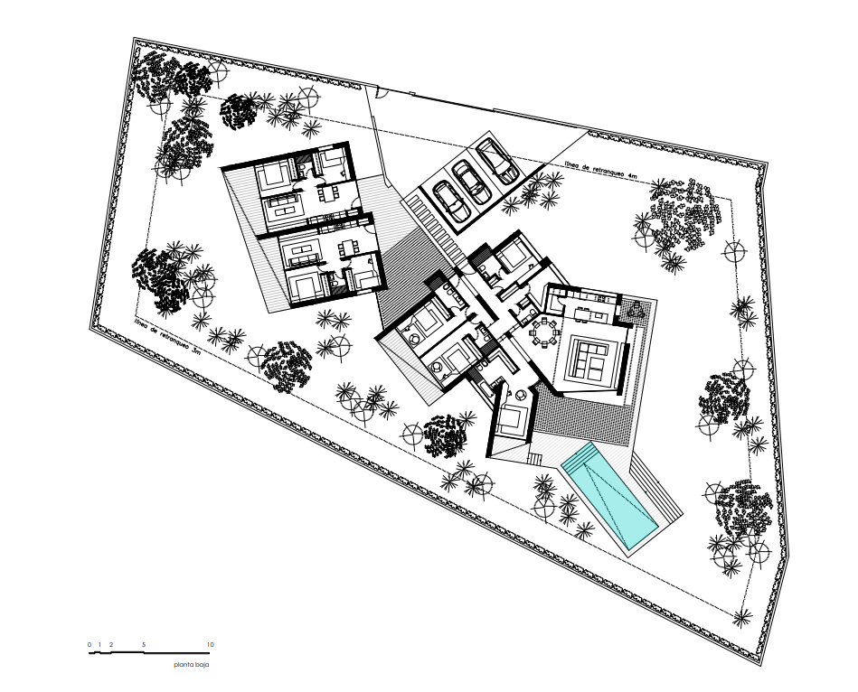 Situada en una parcela irregular, en lo alto del terreno, la Casa Z3 surge de la descomposición del volumen puro y sigue un estricto sentido de la orientación. Se asoma hacia el entorno en cada una de sus estancias, y se adapta el programa según las condiciones que ofrece cada orientación, enmarcando las vistas que proporciona la vegetación existente.